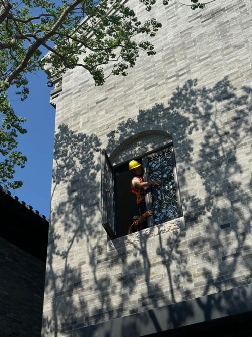 工人們正如同一支默契的交響樂團(tuán),精心地安裝著花窗,陽光透過樹枝的縫隙,投下斑駁的影子,倒映在上面。他們以一顆辛勤的心,塑造著每一處風(fēng)景。
