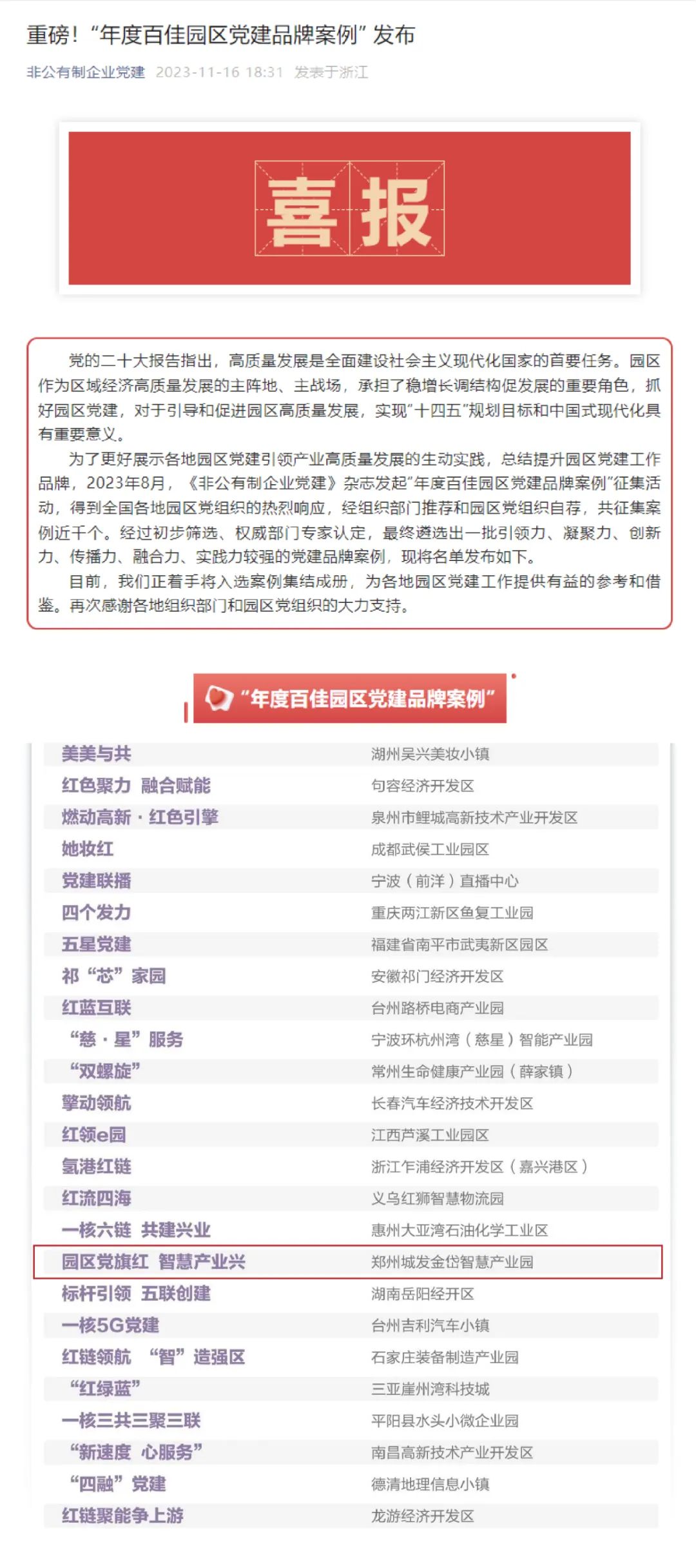 11月16日,由《非公有制企業(yè)黨建》雜志發(fā)起的“年度百佳園區(qū)黨建品牌案例”征集活動(dòng)遴選結(jié)果揭曉。鄭州城發(fā)集團(tuán)“園區(qū)黨旗紅 智慧產(chǎn)業(yè)興”基層黨建“書(shū)記項(xiàng)目”從近千個(gè)入圍案例中脫穎而出,成功入選“年度百佳園區(qū)黨建品牌案例”。
