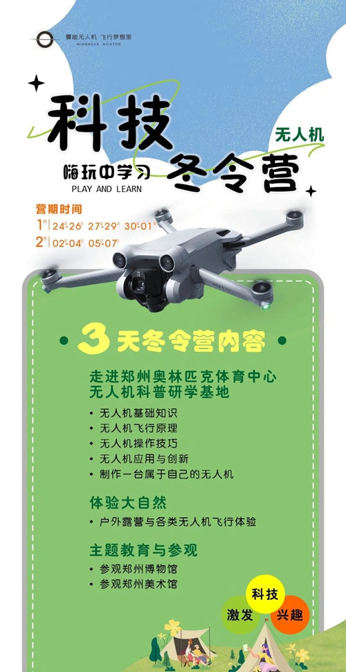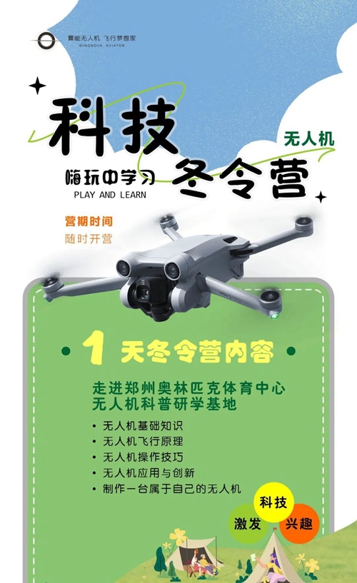 鄭州奧體翼能無人機研學基地是集無人機科普、研學、開發(fā)、應用、賽事運營的綜合服務平臺,不僅擁有1000余平方米的無人機科普教育基地,還擁有無人機駕駛執(zhí)照的培訓資格。寒假期間,依托鄭州奧體中心開闊場館,翼能無人機將科普知識與實操表演完美結(jié)合,分別開設(shè)1至5天不等的科技冬令營,代領(lǐng)孩子們放飛科技夢,在嗨玩中學習。