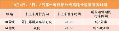 10月4日至6日,鄭州地鐵相關線路延長運營服務時間,請您留意“鄭州地鐵”微信公眾號。
