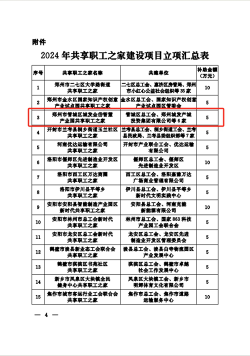 近日,河南省總工會發(fā)布《關(guān)于2024年共享職工之家建設(shè)項(xiàng)目立項(xiàng)的通知》,決定對城發(fā)金岱智慧產(chǎn)業(yè)園共享職工之家等32個共享職工之家建設(shè)項(xiàng)目進(jìn)行立項(xiàng),并對城發(fā)金岱智慧產(chǎn)業(yè)園共享職工之家給予資金補(bǔ)助,鄭州市僅有三家職工之家獲得立項(xiàng),這是城發(fā)金岱智慧產(chǎn)業(yè)園共享職工之家建設(shè)運(yùn)營后取得的第一份殊榮。
