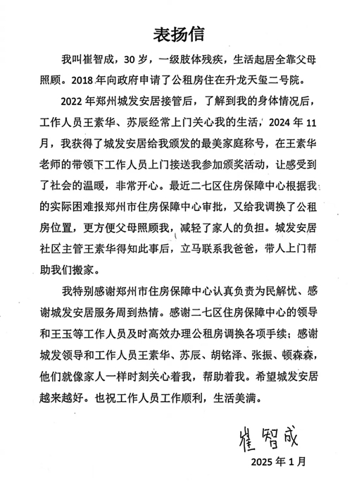 1月9日清晨,崔老師一家分別向住保中心、城發(fā)安居贈送了錦旗,并送來一封表揚信,對住保中心所展現(xiàn)的認真負責(zé)態(tài)度以及為民解憂的卓越作風(fēng)表達了高度贊揚,同時也對城發(fā)安居工作給予了肯定鼓勵。