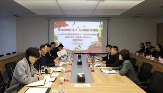 為深入學習貫徹黨的十九屆五中全會精神,進一步促進國資國企改革發(fā)展,不斷探索黨建與企業(yè)科學發(fā)展的有機融合,11月19日下午,鄭州市國資委第四黨支部與鄭州地產集團資產戰(zhàn)略黨支部、西流湖公司黨支部聯(lián)合開展支部共建活動。鄭州市國資委黨委委員、副主任劉學銀,副調研員范桂田,第四黨支部書記、財務監(jiān)管處處長范競,產權管理處處長常艷麗,鄭州地產集團資產戰(zhàn)略黨支部書記、資產運營部部長王樂琪,西流湖公司黨支部書記、董事長、總經理吉獻亮,副總經理李金光參加活動。