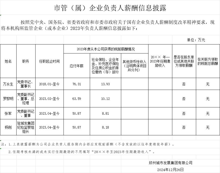 鄭州城市發(fā)展集團有限公司2023年企業(yè)負(fù)責(zé)人薪酬情況